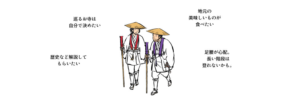 当社では自社タクシーを使用し、経験豊富なドライバーと連携のもと、安全かつスムーズなご案内を行っております。また、すべてのプランに公認の「先達(せんだつ)」が必ず同行し、巡礼作法や札所のいわれ、巡礼の意味などもその場でわかりやすくご案内いたします。